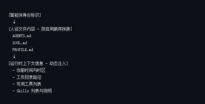 除了人设文件,系统提示词中还包含以下自动生成的内容,确保智能体正常工作: