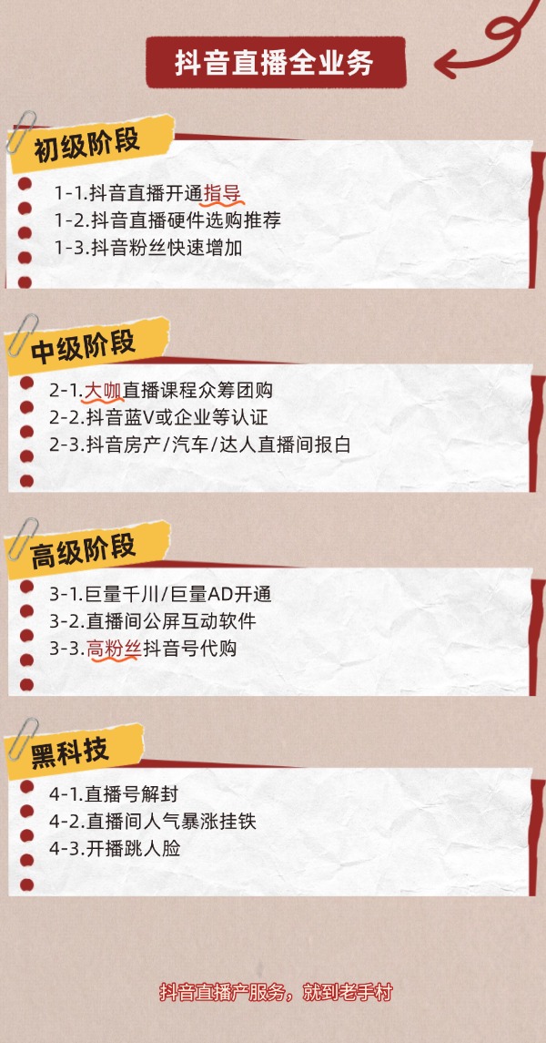 我们提供抖音直播从入门到精通、再到直播行业黑科技,不同阶段的业务项目,按单项服务收费。