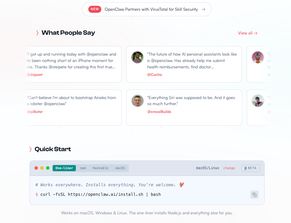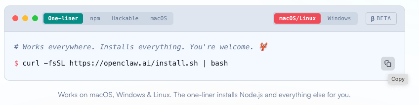 打开浏览器,访问OpenClaw官网(openclaw.ai),下拉页面找到「Quick Start」部分,根据自己的操作系统型号复制对应的安装代码。