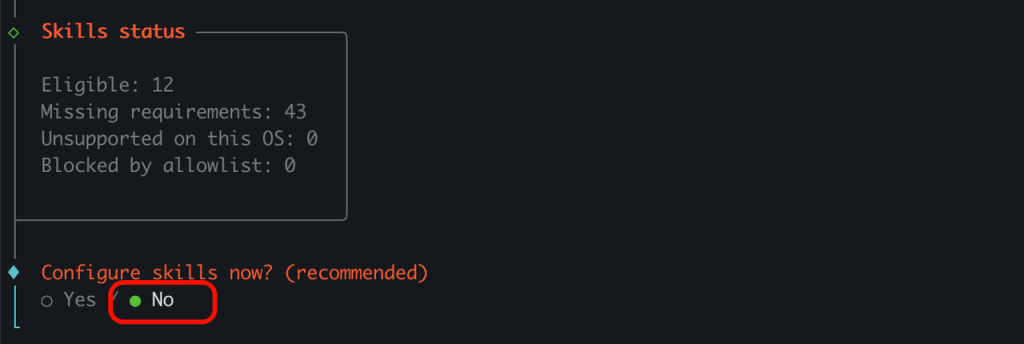 skills 配置,选择 No。先跑通流程,后面再配置