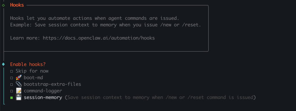 配置Hooks,这个选择 session-memory(切换到对应的选项,按空格键)。