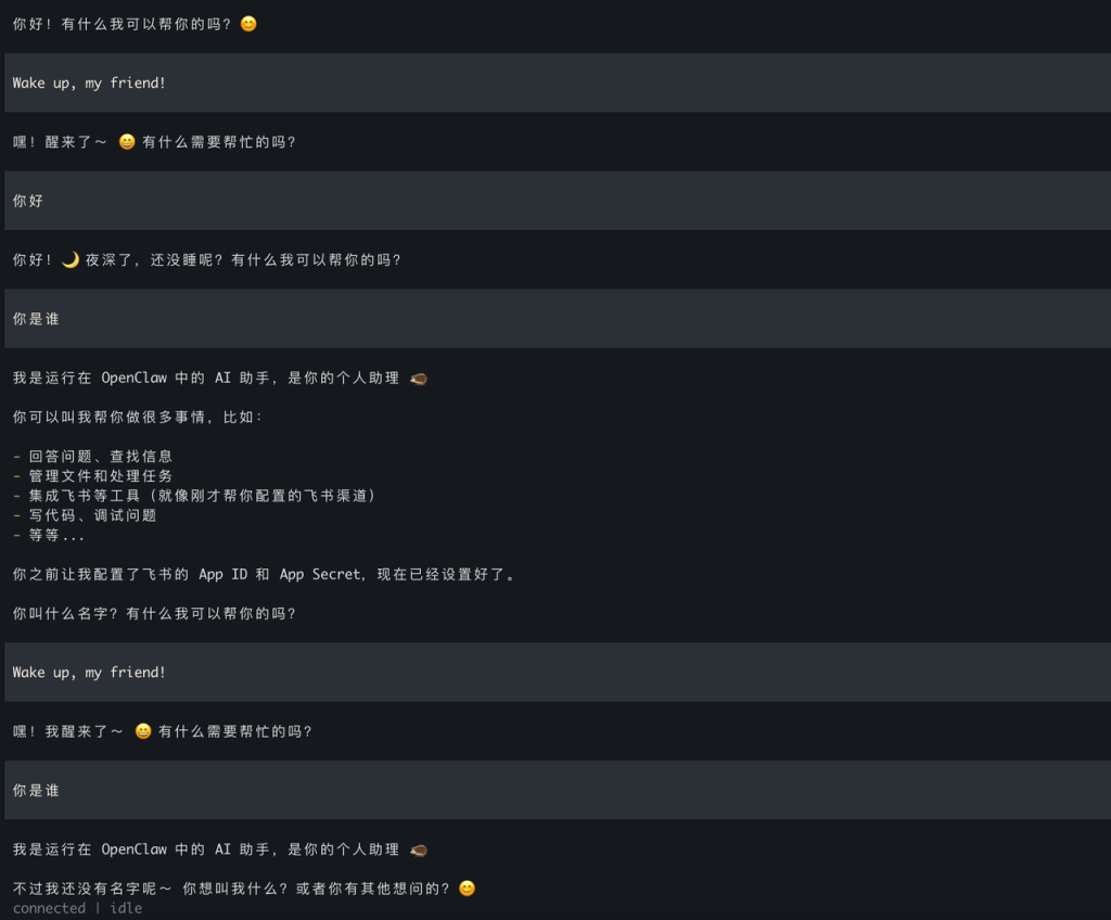 然后就可以在对话框中进行对话,到此,OpenClaw 配置完毕了。