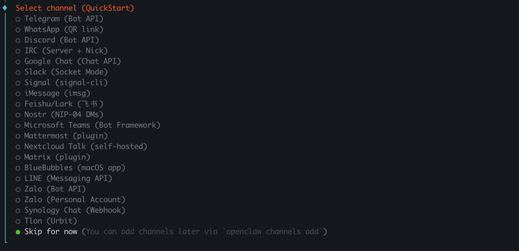 接下来配置通道,先跳过 Skip for now。先跑通流程,后续再配置