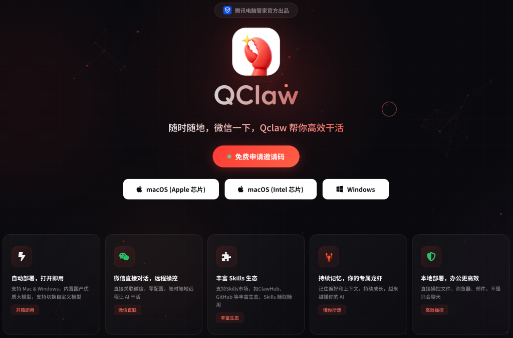 QClaw 是腾讯电脑管家基于 OpenClaw 开源生态打造的本地化 AI Agent 助手,被大家亲切称为 “小龙虾 AI”。它无需复杂配置,三步即可上手,自带安全防护;支持微信直连绑定,无论你身处何地,通过微信发送指令,就能让电脑自动完成报表处理、文件传输、文档编辑等工作,数据安全不出本地,适合办公、创作、开发等多场景使用。产品内置多款优质国产大模型,拥有丰富技能生态与超强上下文记忆能力,还能一键关联已安装的 OpenClaw,是真正懂你、帮你高效干活的智能搭档。