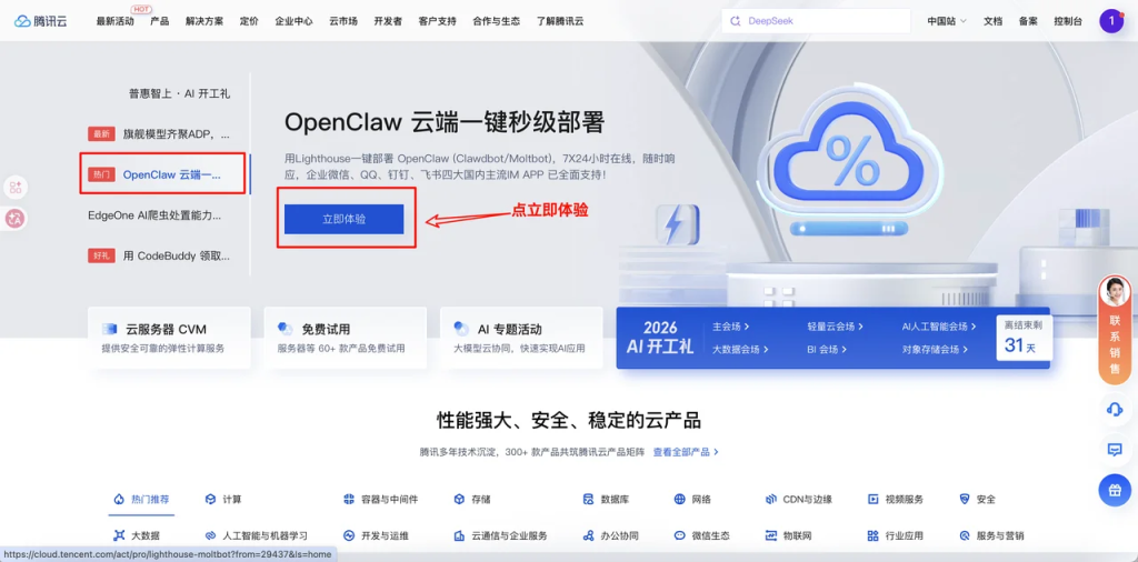 Openclaw 云服务器部署教程(图文) 云服务器选择 2核2G 就够用了,阿里云/腾讯云都可以。 购买云服务器 腾讯云已经支持 OpenClaw,免去安装环境和依赖 https://cloud.tencent.com/act/pro/lighthouse-moltbot#HW 点击立即体验,进入如下界面,点击立即部[……]继续阅读