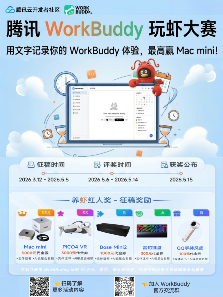 在数字化办公日益普及的当下,一款高效的办公工具能极大提升工作效率,而腾讯推出的 WorkBuddy 正凭借实用功能成为不少职场人的新选择。目前,腾讯 WorkBuddy 玩虾大赛征稿活动已火热开启,诚邀所有使用者分享真实使用体验,更有 Mac mini、PICO 4 VR、Bose 音响等丰厚奖品等你来赢,快来参与活动解锁专属福利!